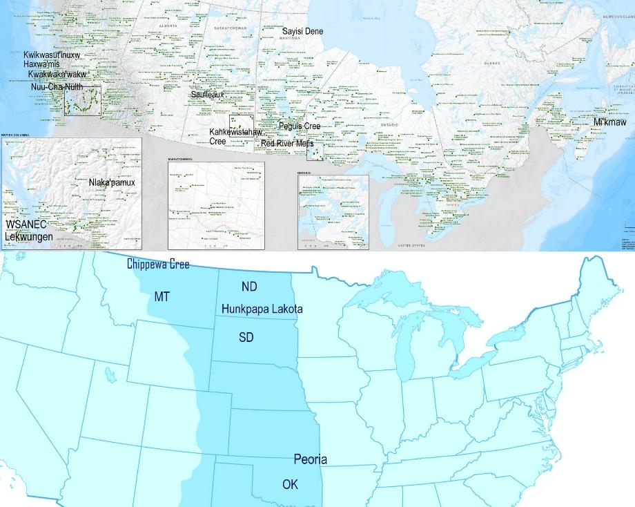 orientation: Chippewa Cree peoples' territory is directly below mid-Alberta. Hunkpapa Lakota peoples' territory